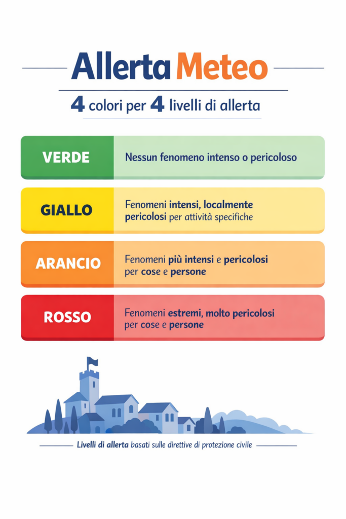 Per comunicare i messaggi di allerta si segue un sistema basato sul codice colore in una scala di allertamento, condivisa a livello nazionale ed europeo, che va dal verde (nessuna criticità) al giallo, all’arancione e al rosso.